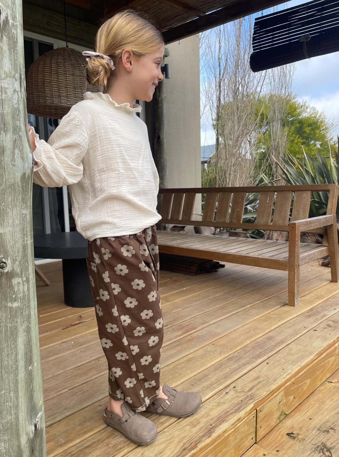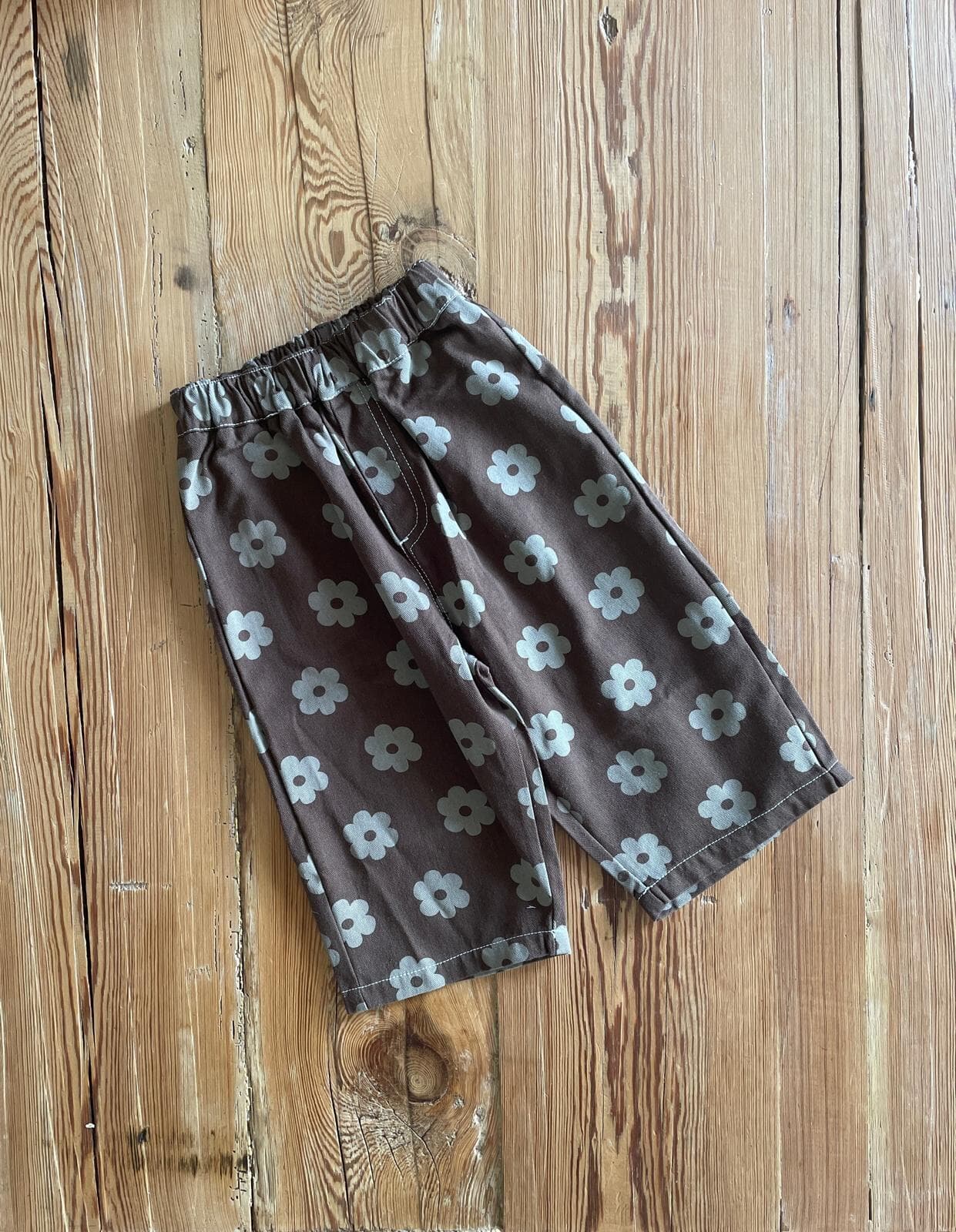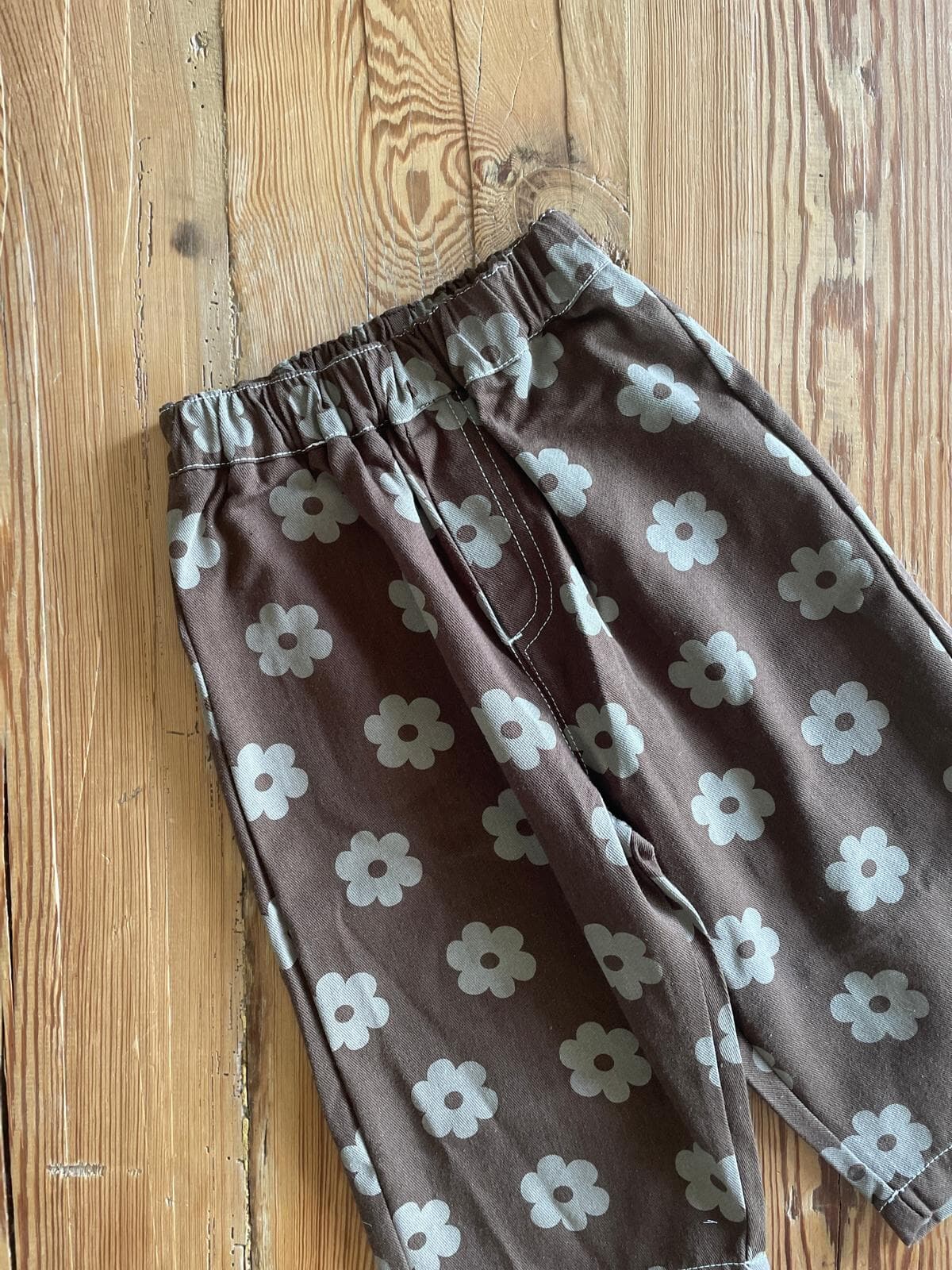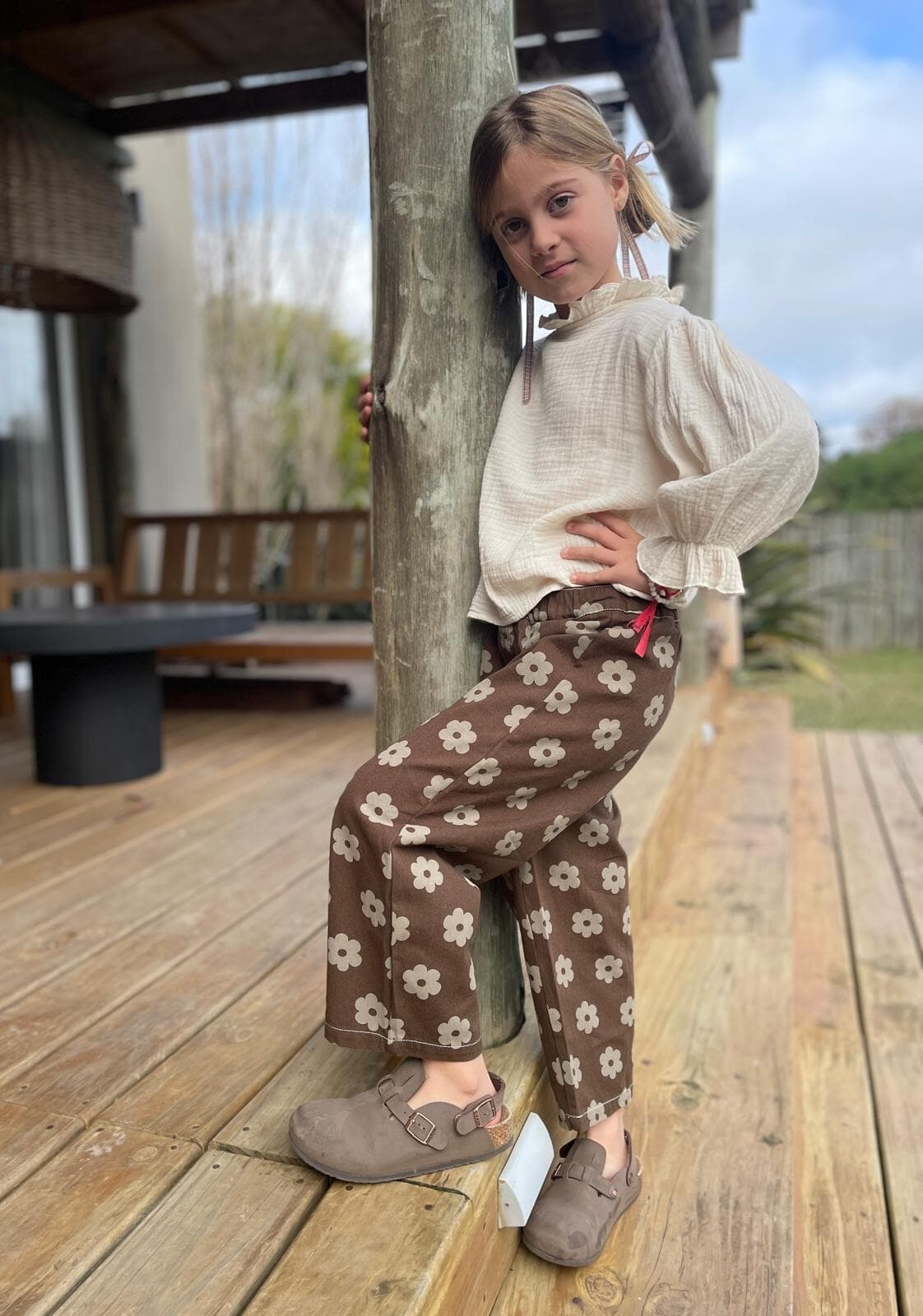 Pantalón de jean de algodón, color marrón, con flores beige, holgado y súper cómodo.