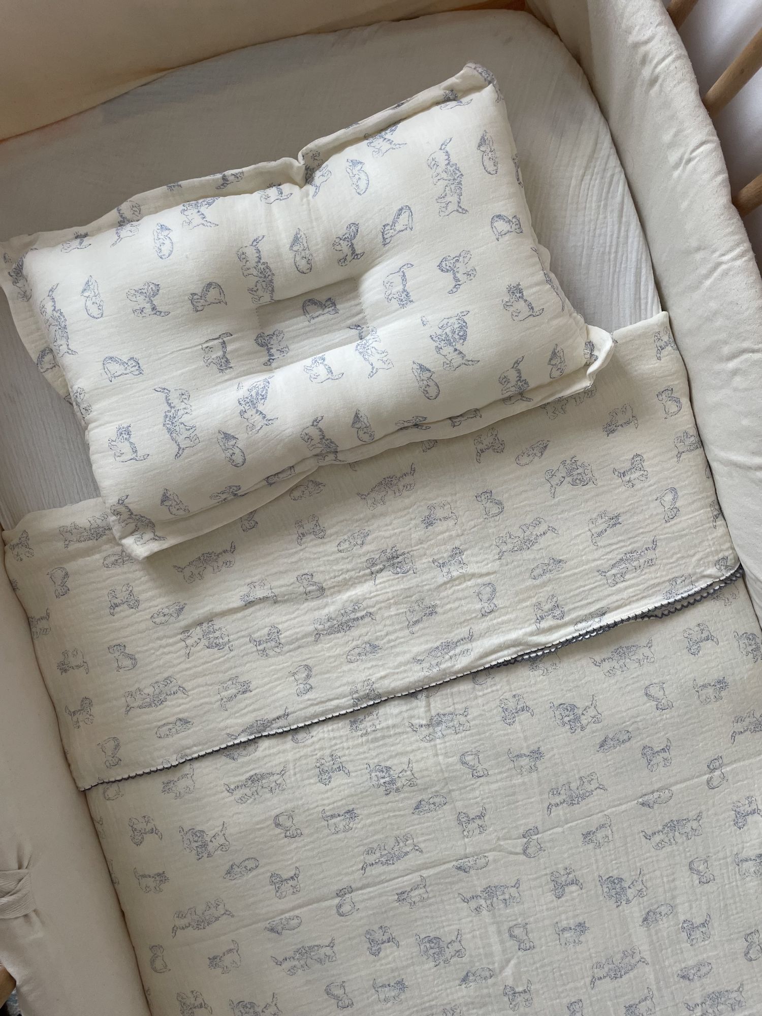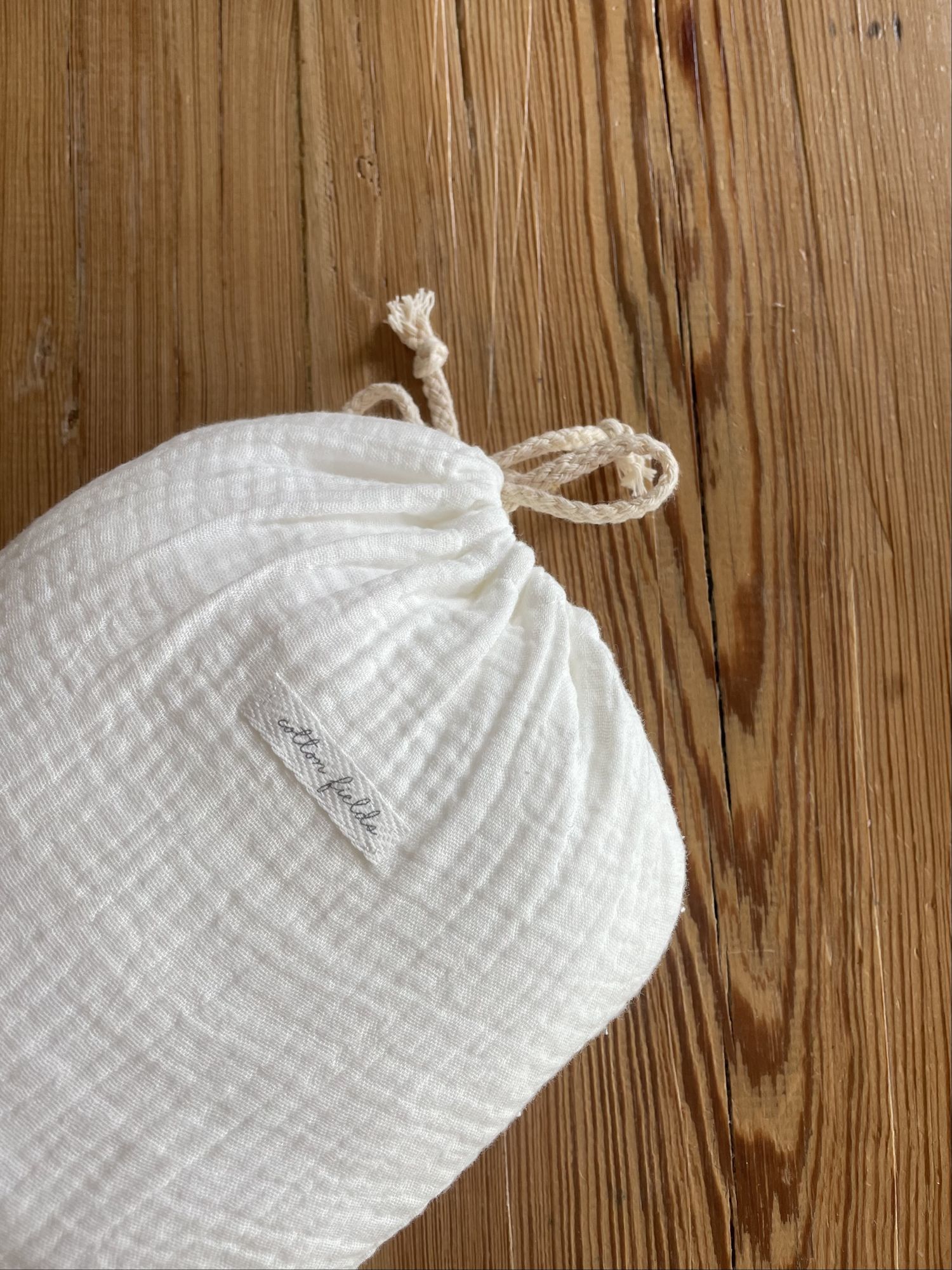 Sábana bajera para cuna tipo IKEA o cuna funcional confeccionada en muselina de algodón 100% orgánico. Son para un colchón de 70 cm de ancho x 130 cm de largo x 22 cm de alto. Tiene elástico por lo que la medida es adaptable.